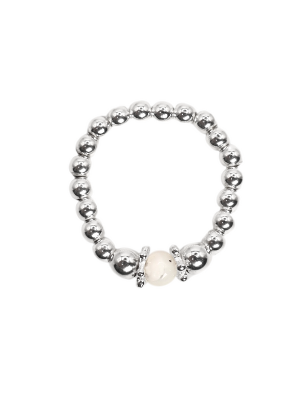 This Mother of Pearl ring is expertly crafted with one stunning mother of pearl bead and sterling silver components. Experience the natural beauty and elegance of mother of pearl with this timeless piece.